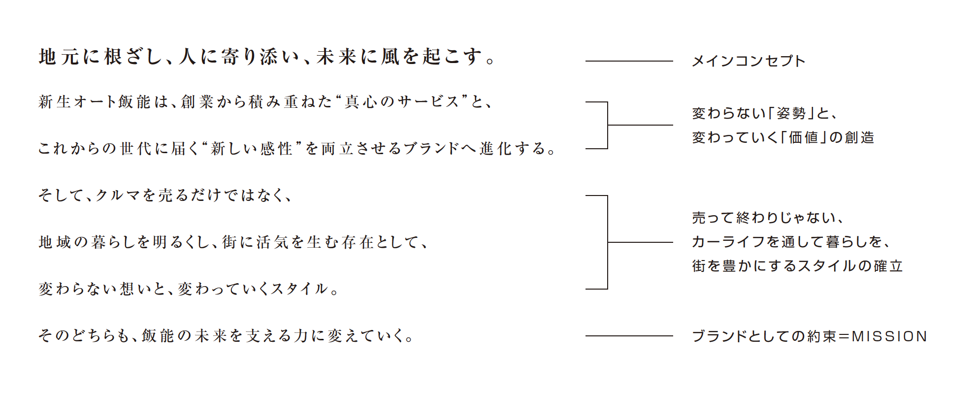 ヒアリングや現地訪問を重ねる中で見えてきたのは、新生オート飯能様が大切にしてきた以下の価値観でした。