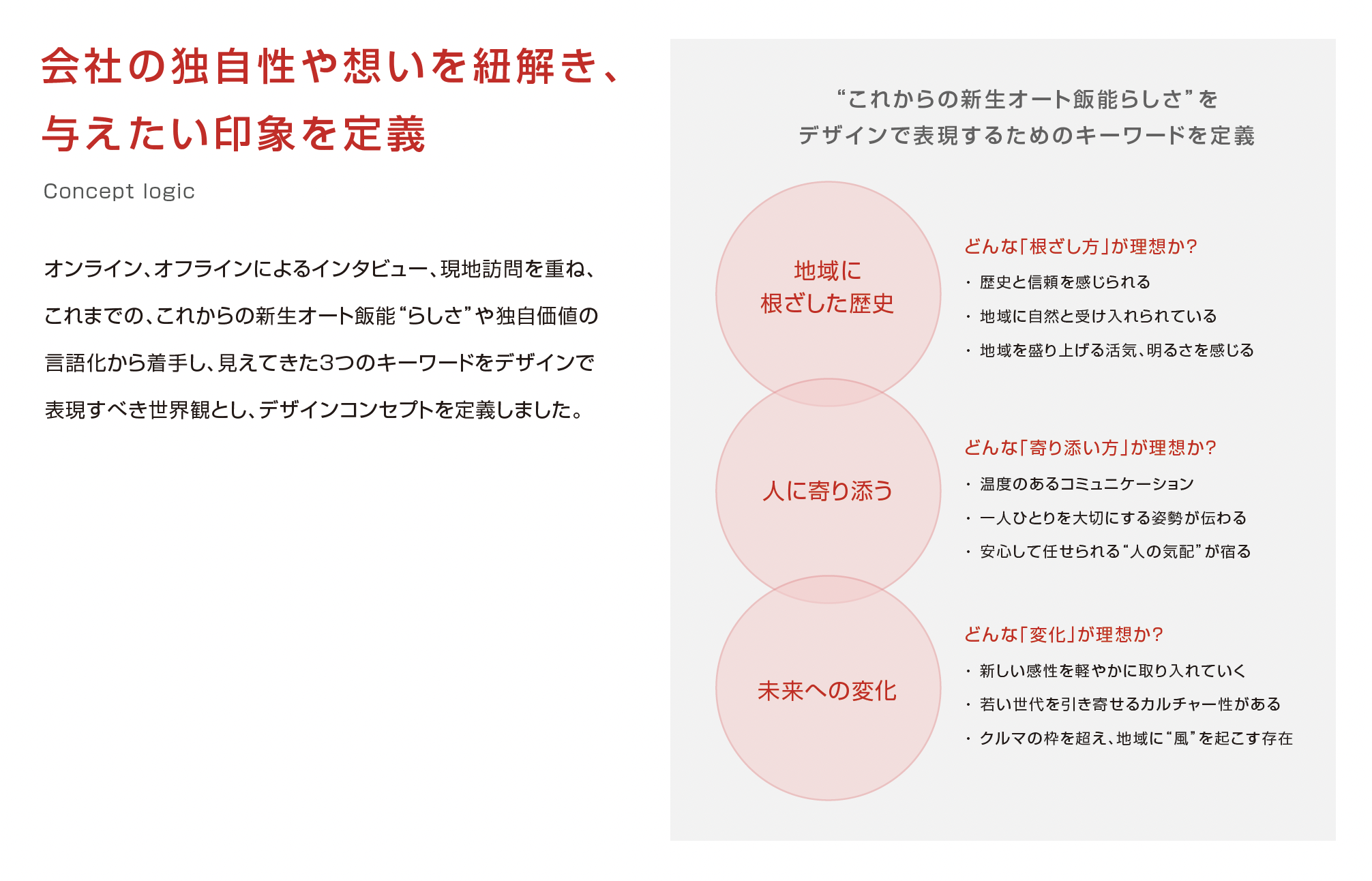 これらを軸に、「変わらない姿勢」と「変わっていく価値」を両立させるブランドコンセプトを定義。