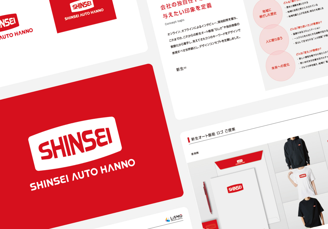 新生オート飯能様では、看板・Web・販促物などで複数のロゴ表現が混在しており、