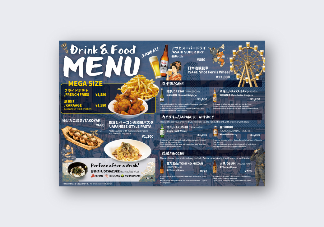 といった要素をもっています。「外国人受けする日本的なデザイン」と「知識がなくても伝わるメニュー内容」を同時に伝えることを目的としています。