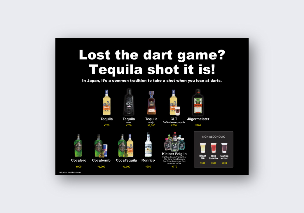 ダーツを楽しんでもらうことに加え、ショットを勧めることで単価アップの戦略を外国人にも伝えるために、裏面にはその文言を掲載しています。